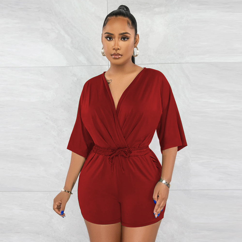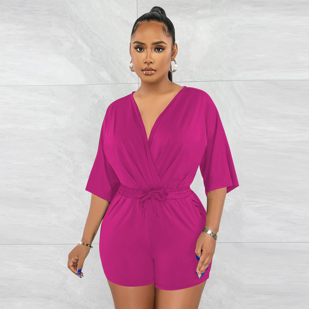 Solid Color V Neck Fitted Waist Jumpsuit Casual Shorts