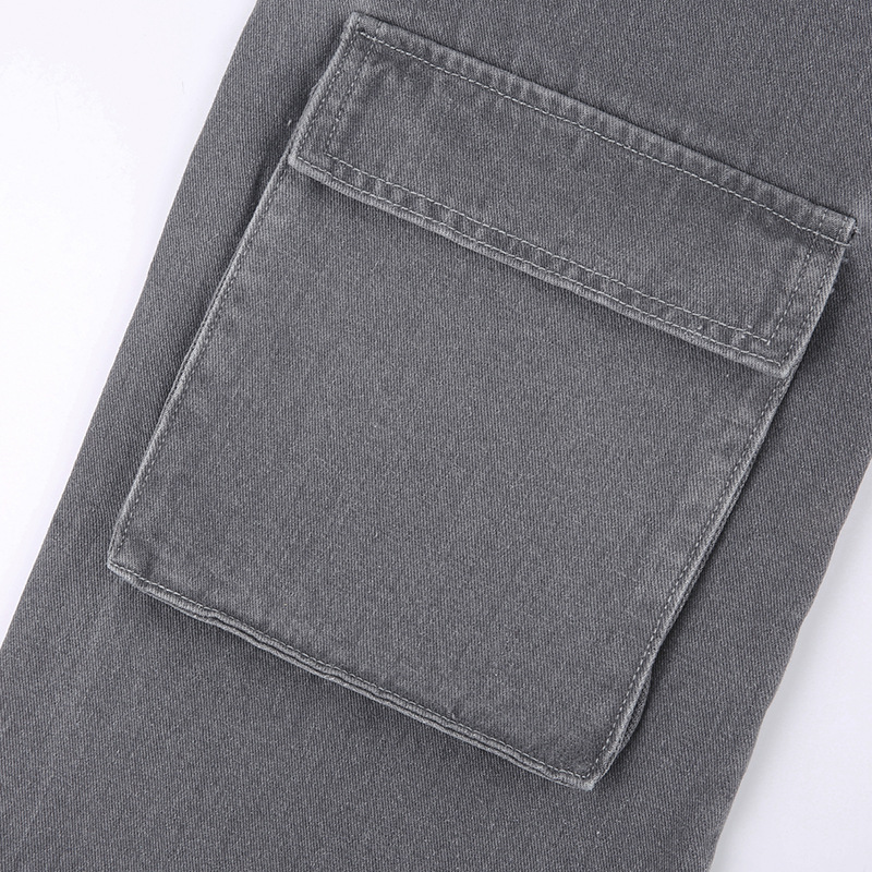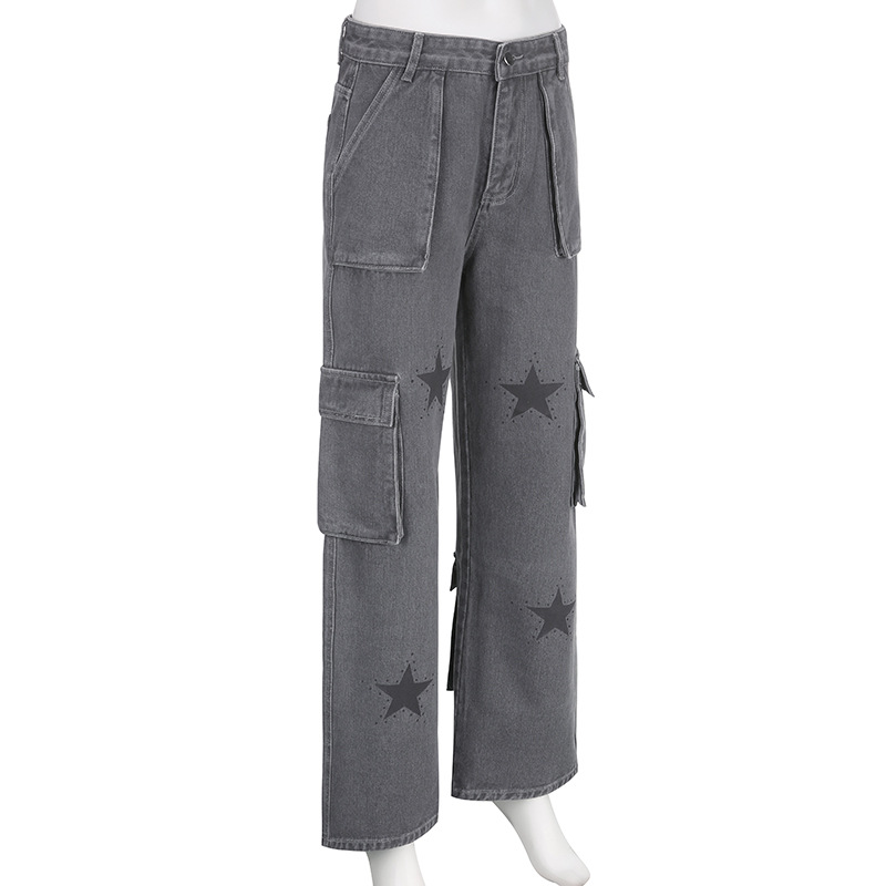 Street Retro Low Waist Denim Overalls Printed Large Pocket Straight Casual Pants