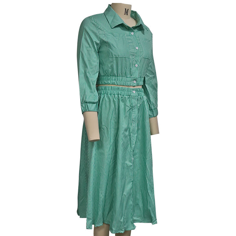 Stylish Long Sleeves Striped Shirt Outfit Skirt Two Piece Set