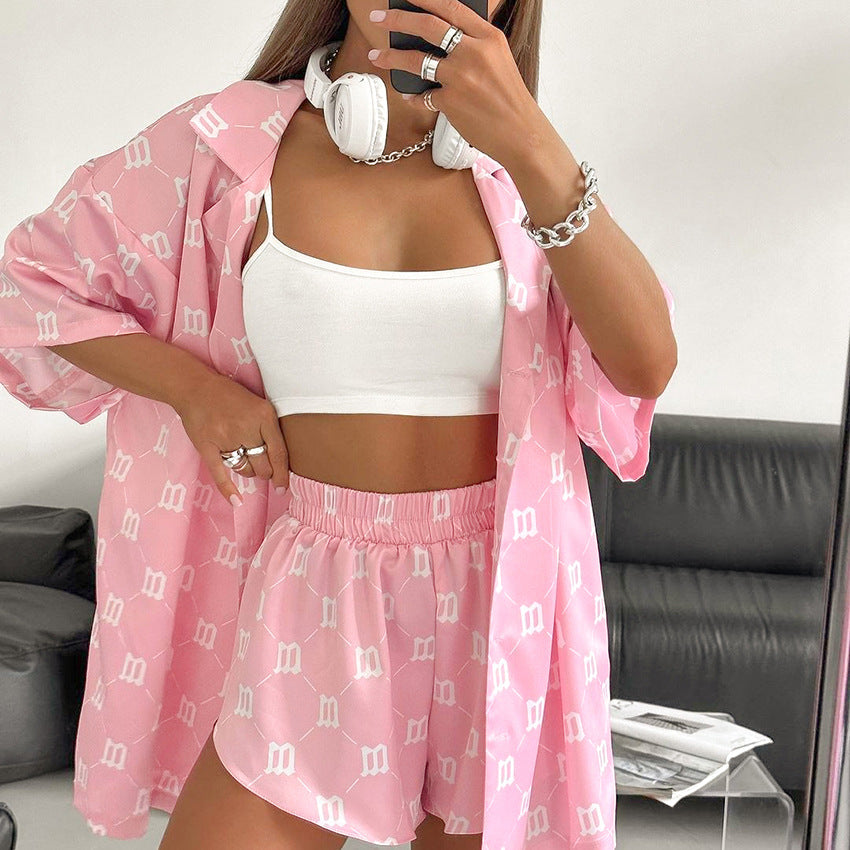 Textured Silk-like Printed Pajamas Thin Cardigan Shorts Set