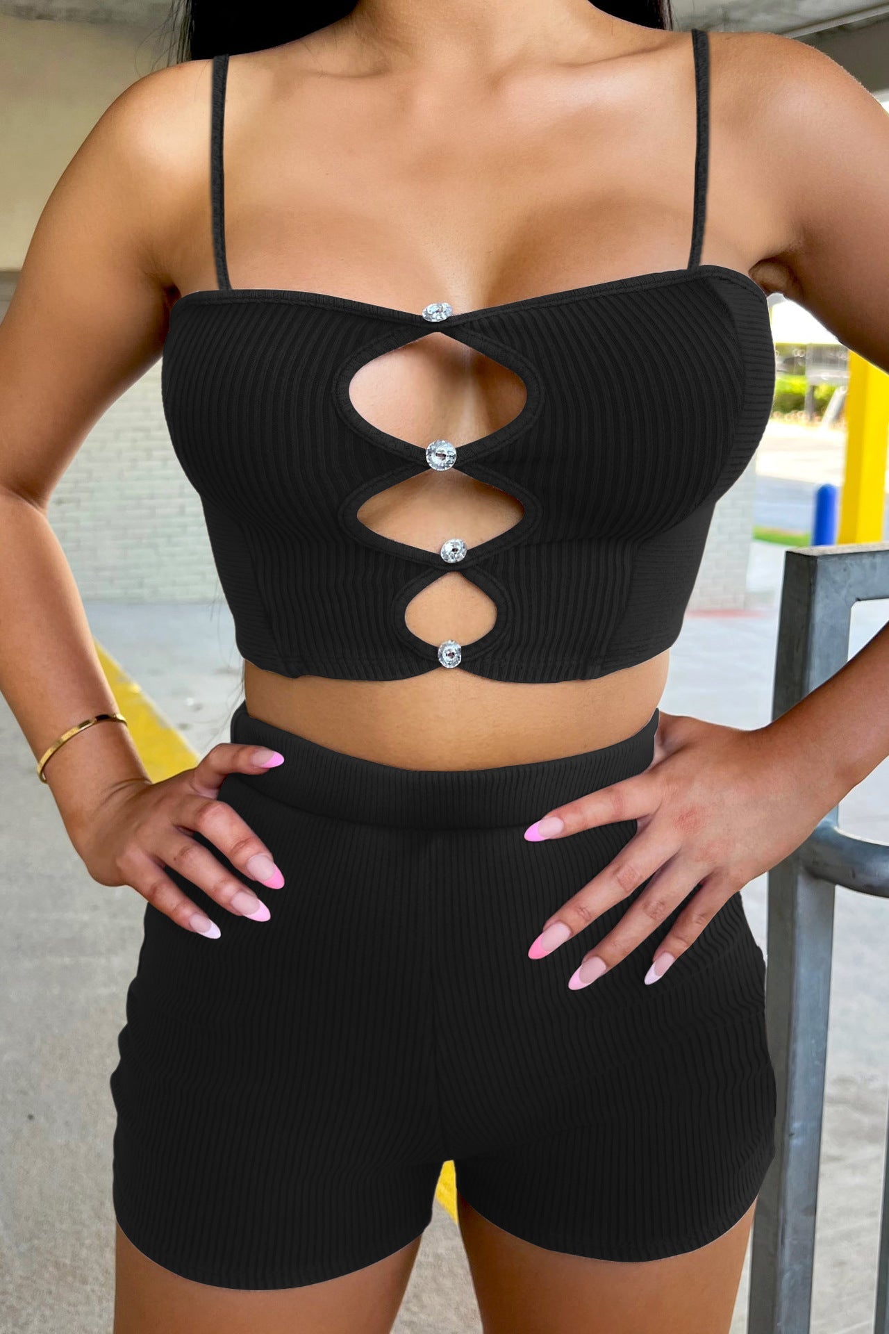 Thread Hollow Out Camisole Shorts High Waist Casual Two Piece Suit