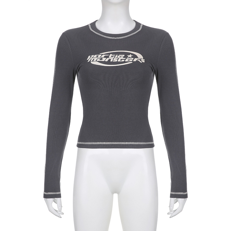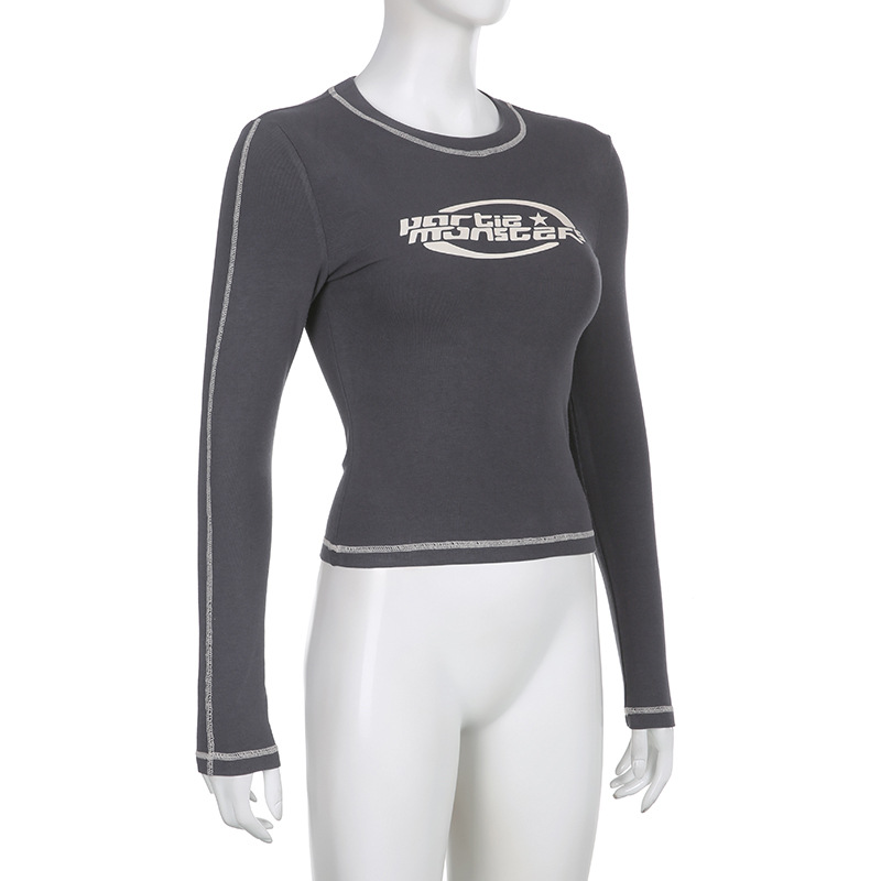 Thread Printed Long Sleeved T Shirt Niche Reverse Car Letter Graphic Pullover Round Neck Slim Bottoming Short Top