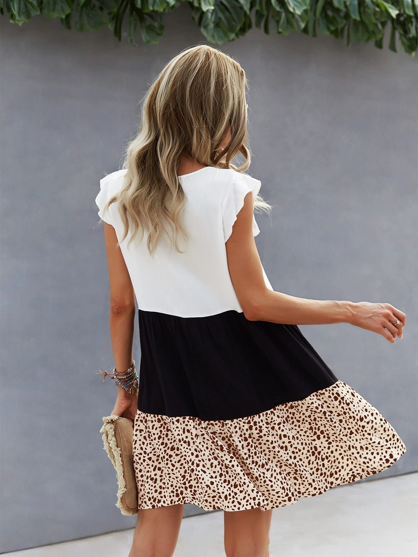 Three Color Stitching Dress Contrast Color Leopard Print Flying Short Sleeve A Line Dress