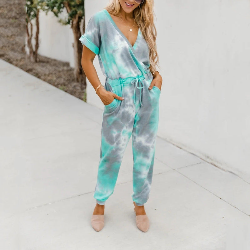 Tie Dyed Printed V Neck Short Sleeved Casual Jumpsuit