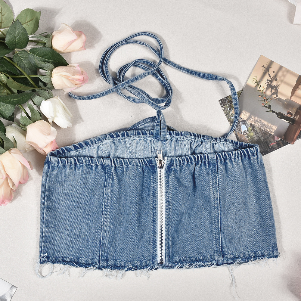 Trendy Halter Tube Top Three Dimensional Floral Denim Top