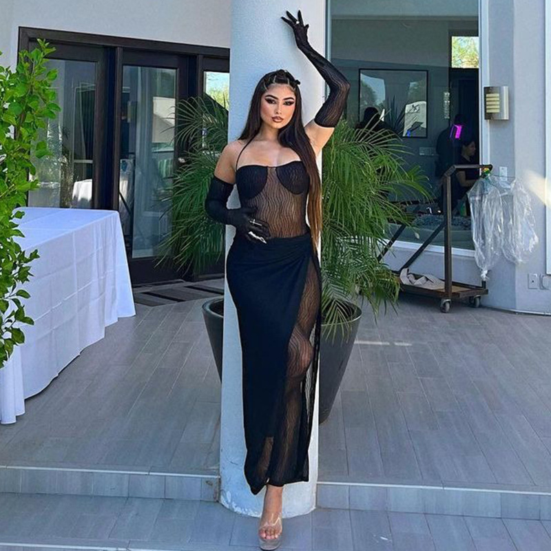 Tube Top Lace up See through Jumpsuit Slim Fit Slit Skirt Set