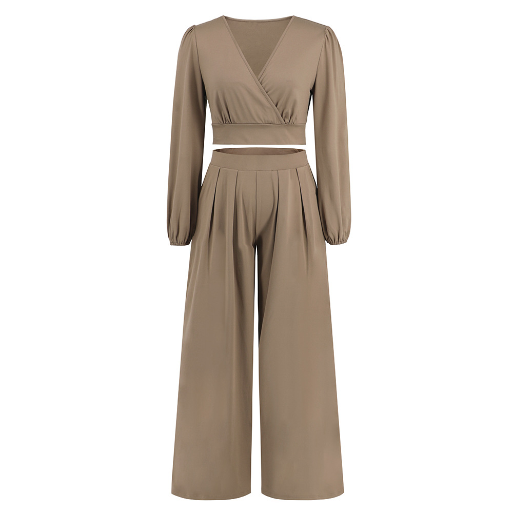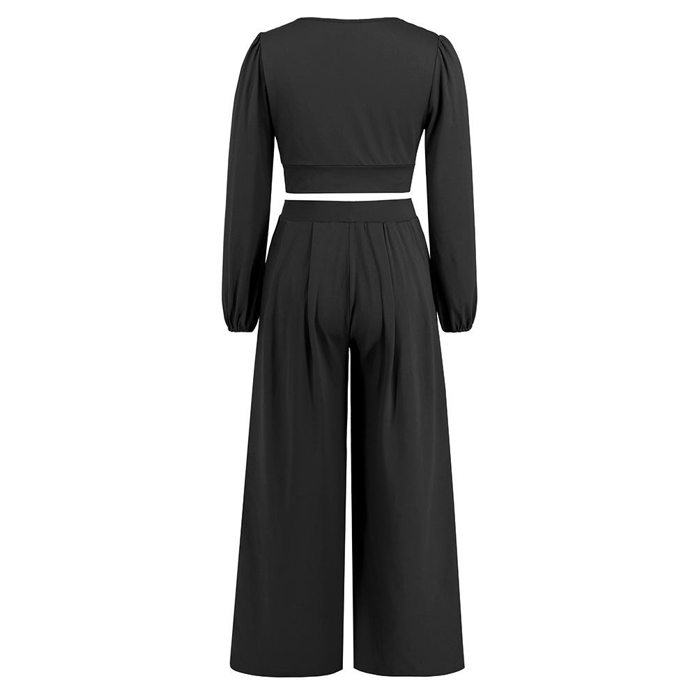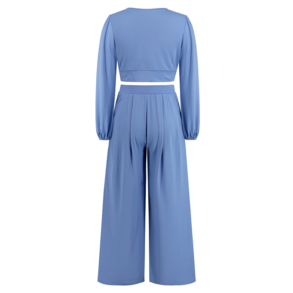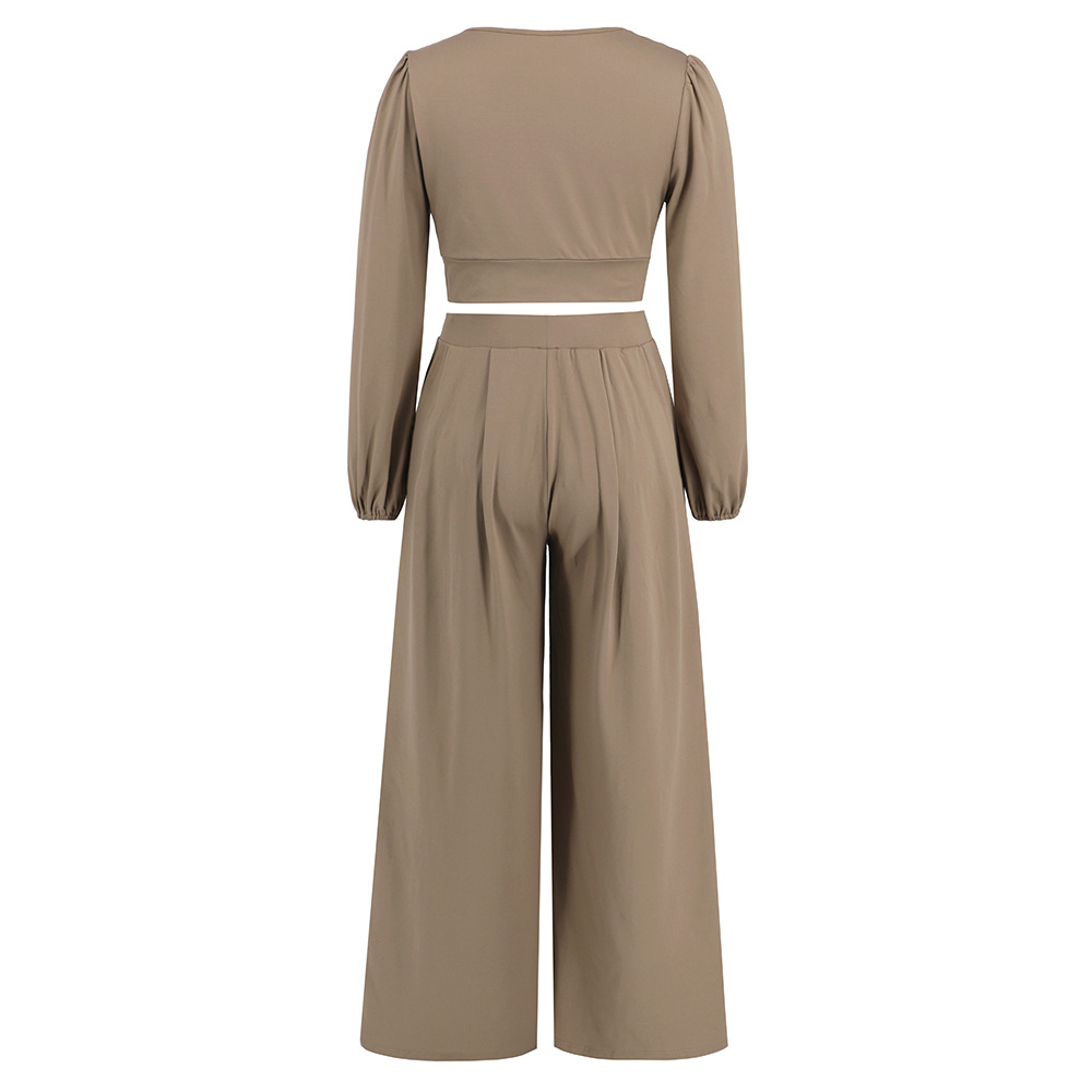 V neck Long Sleeved Short Top Straight Leg Trousers Two Piece Set