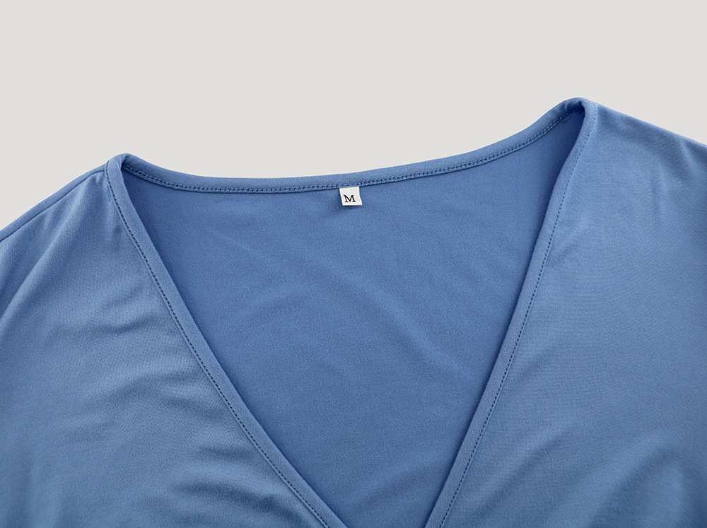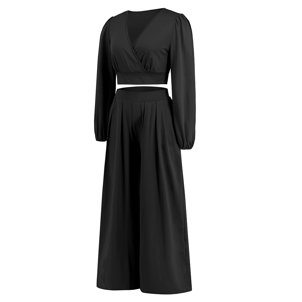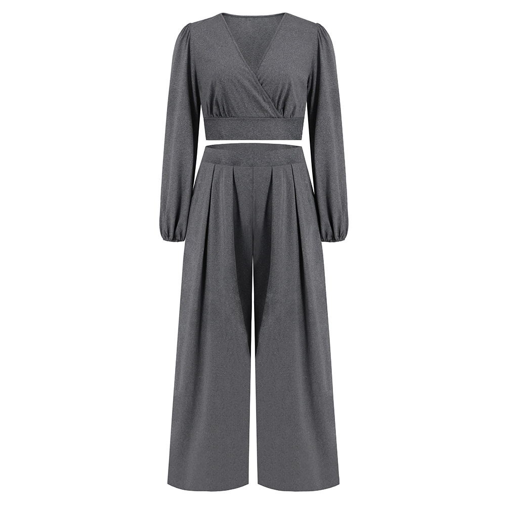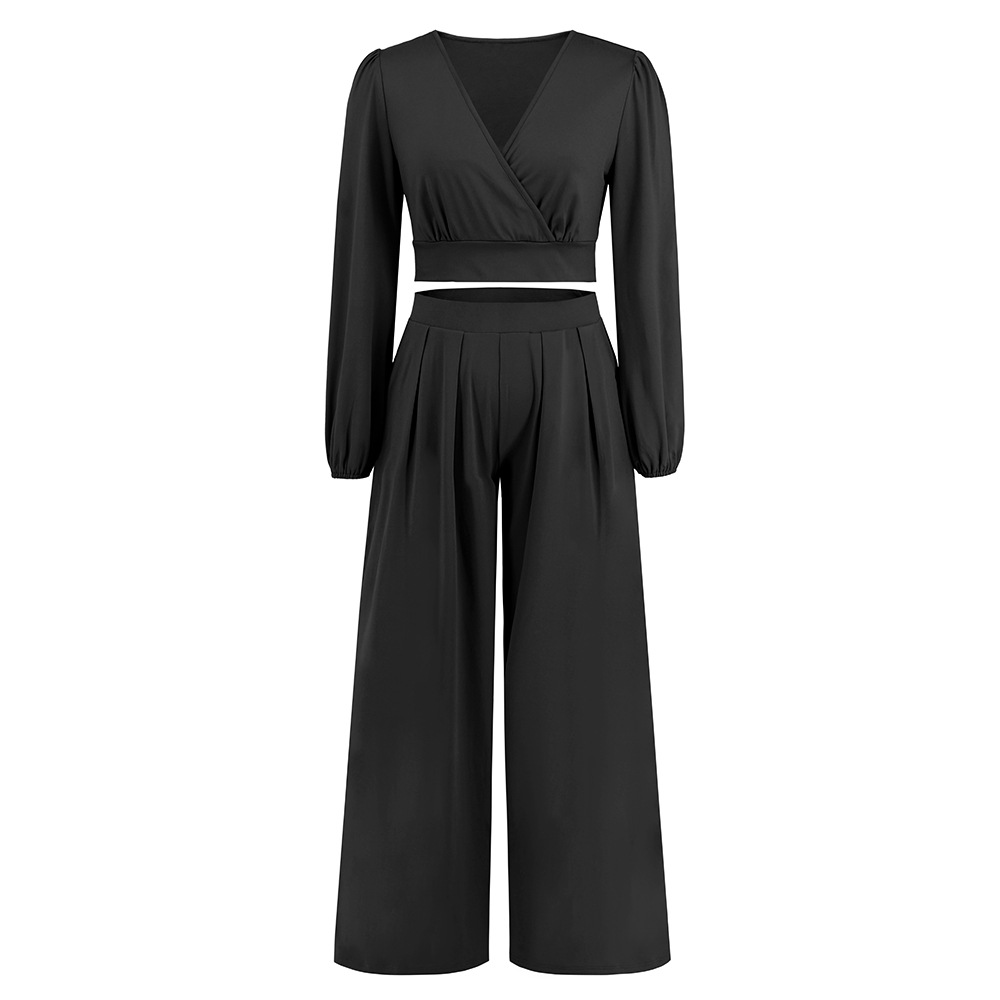 V neck Long Sleeved Short Top Straight Leg Trousers Two Piece Set