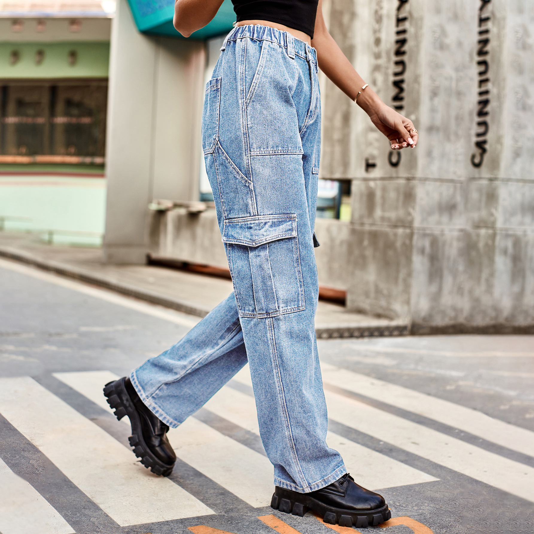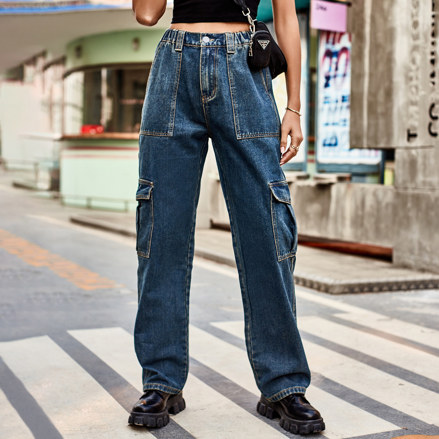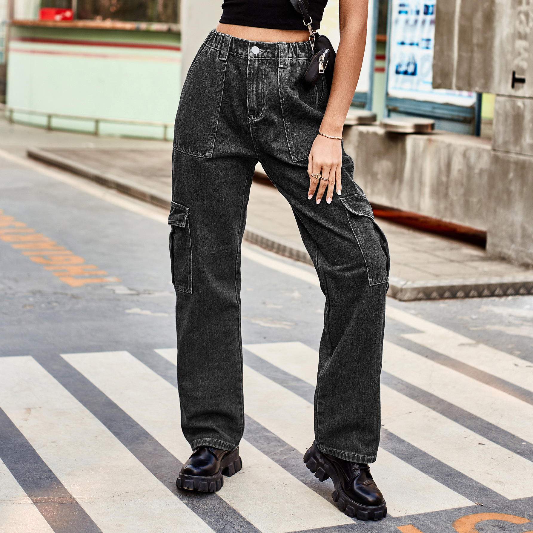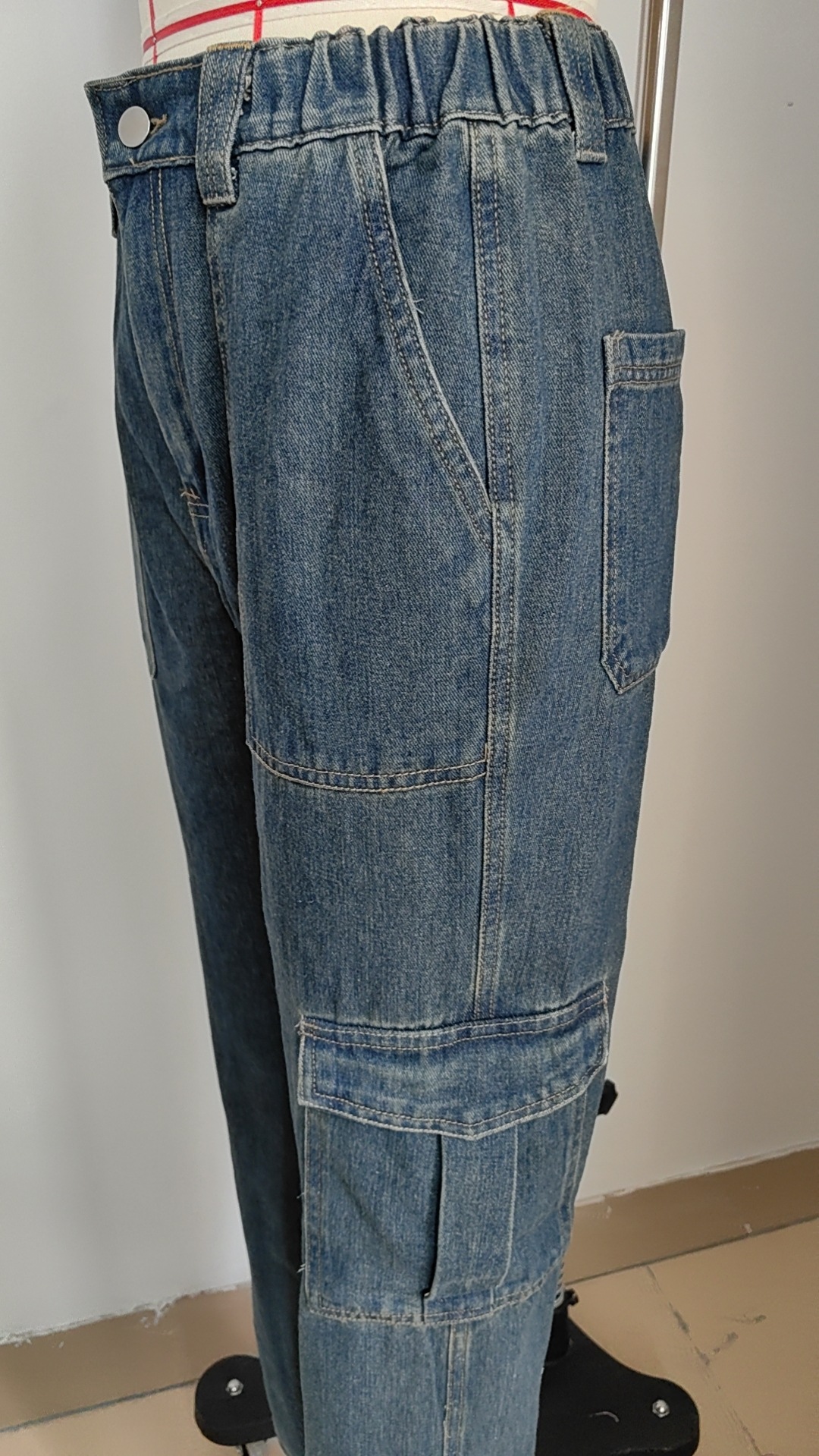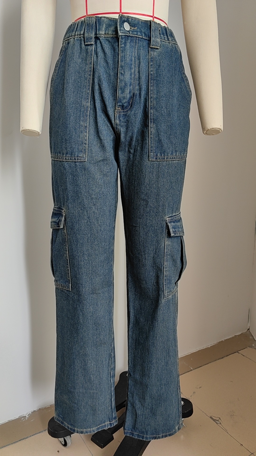 Washed Semi Elastic Personality Denim Cargo Pants Casual Pants