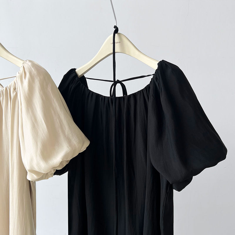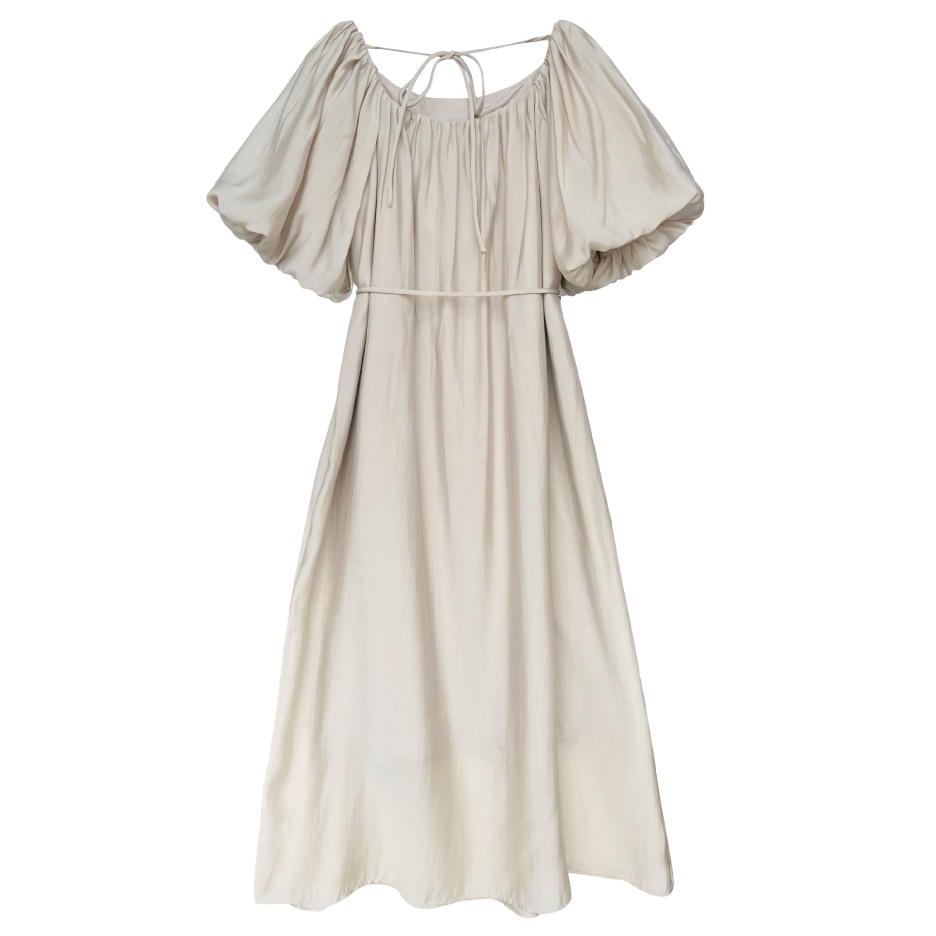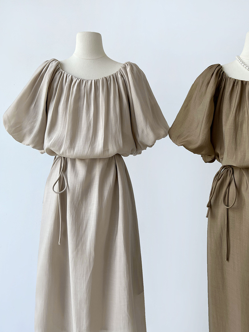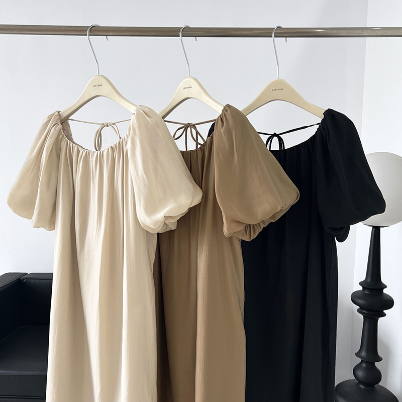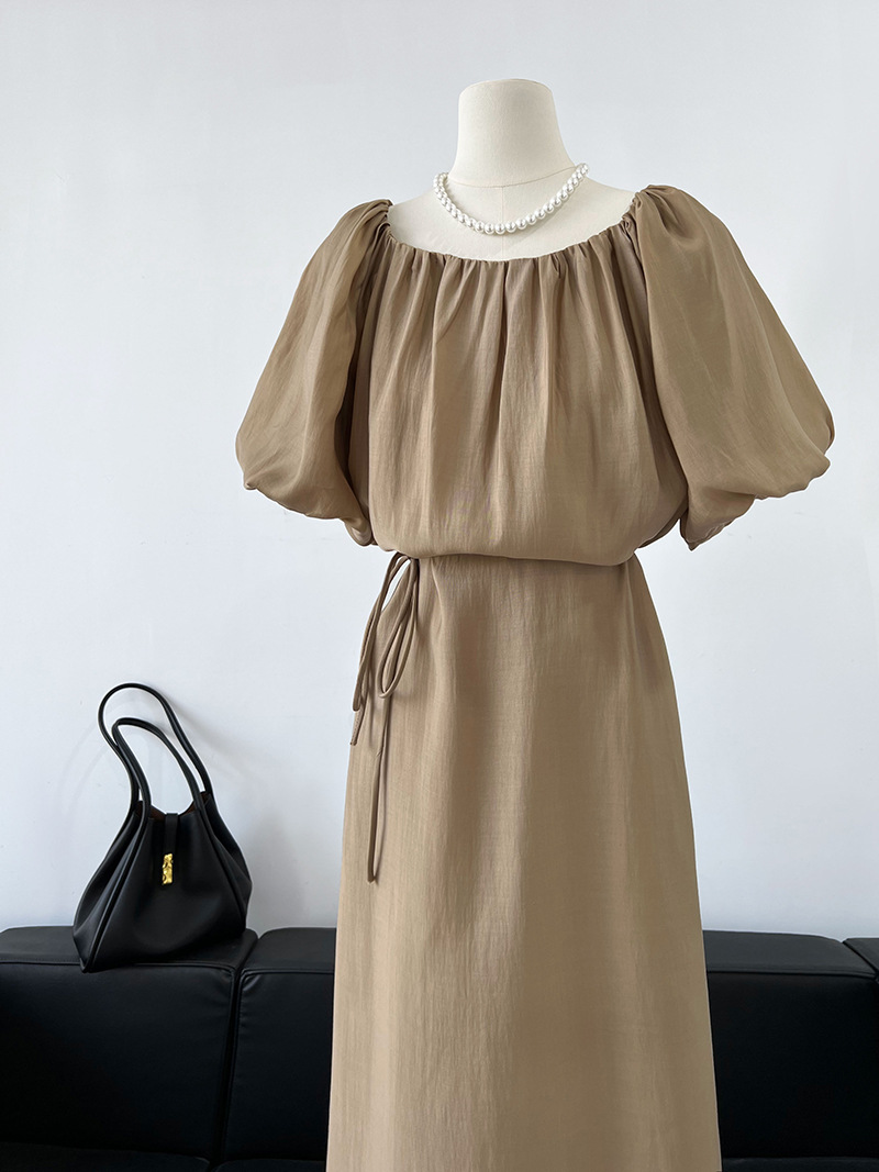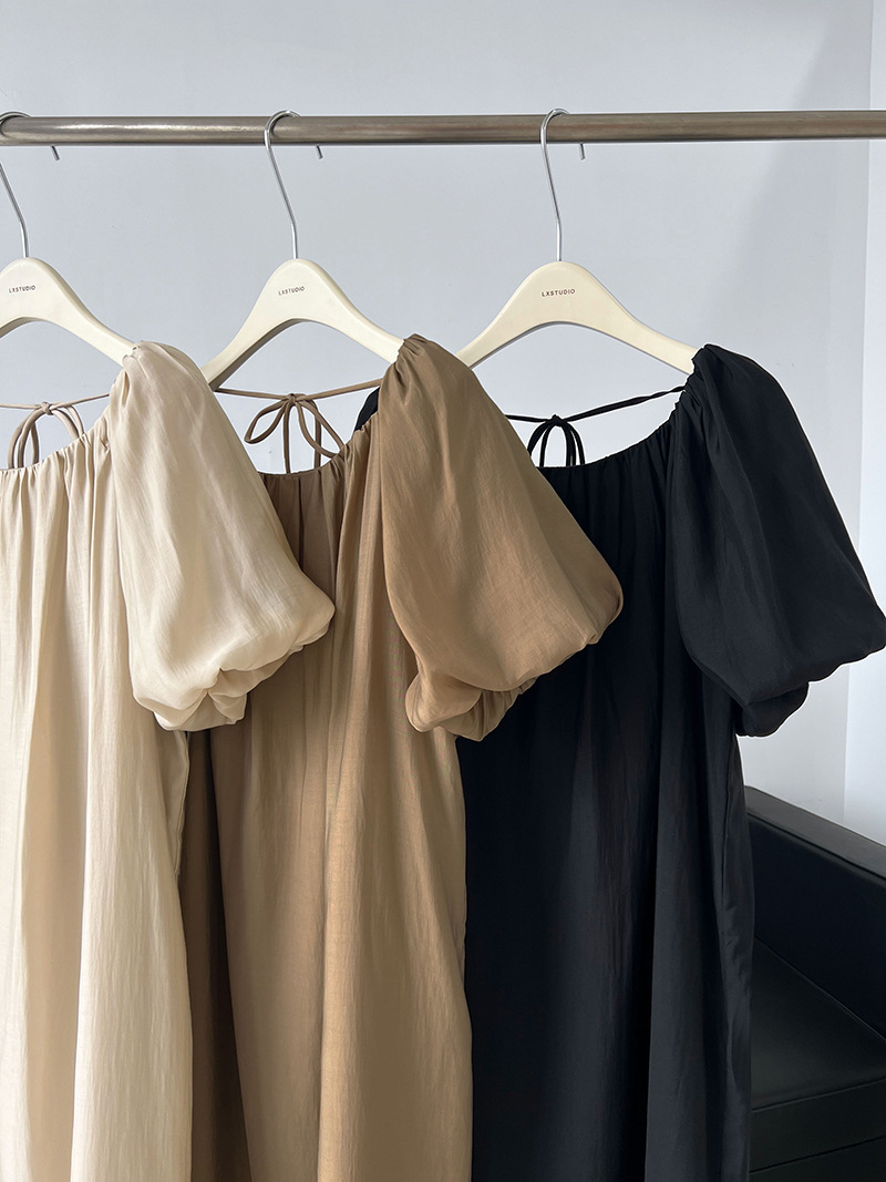 Wear Both Tencel Puff Sleeve Dress Korean Thin Lace up Waist Tight Square Collar Fairy Dress