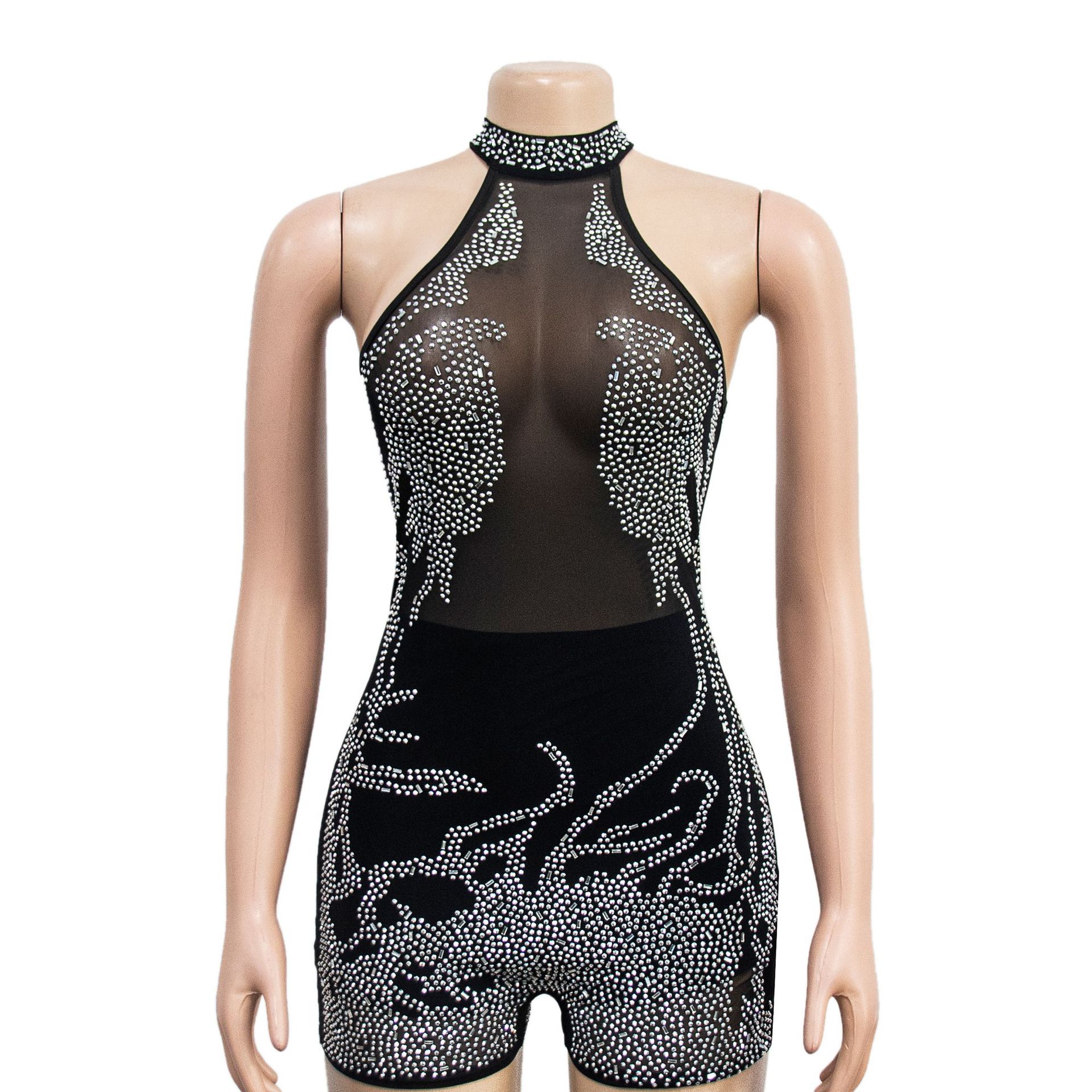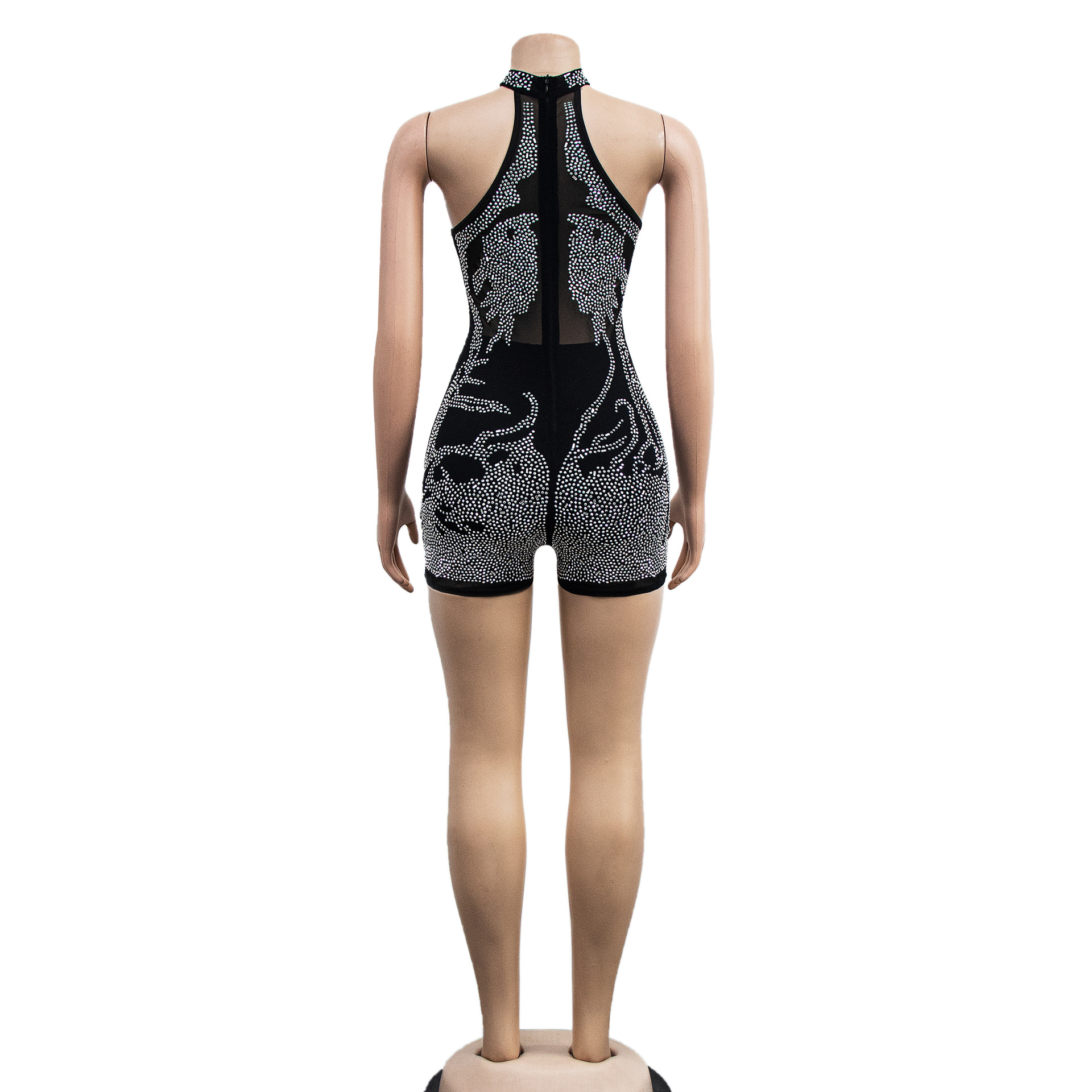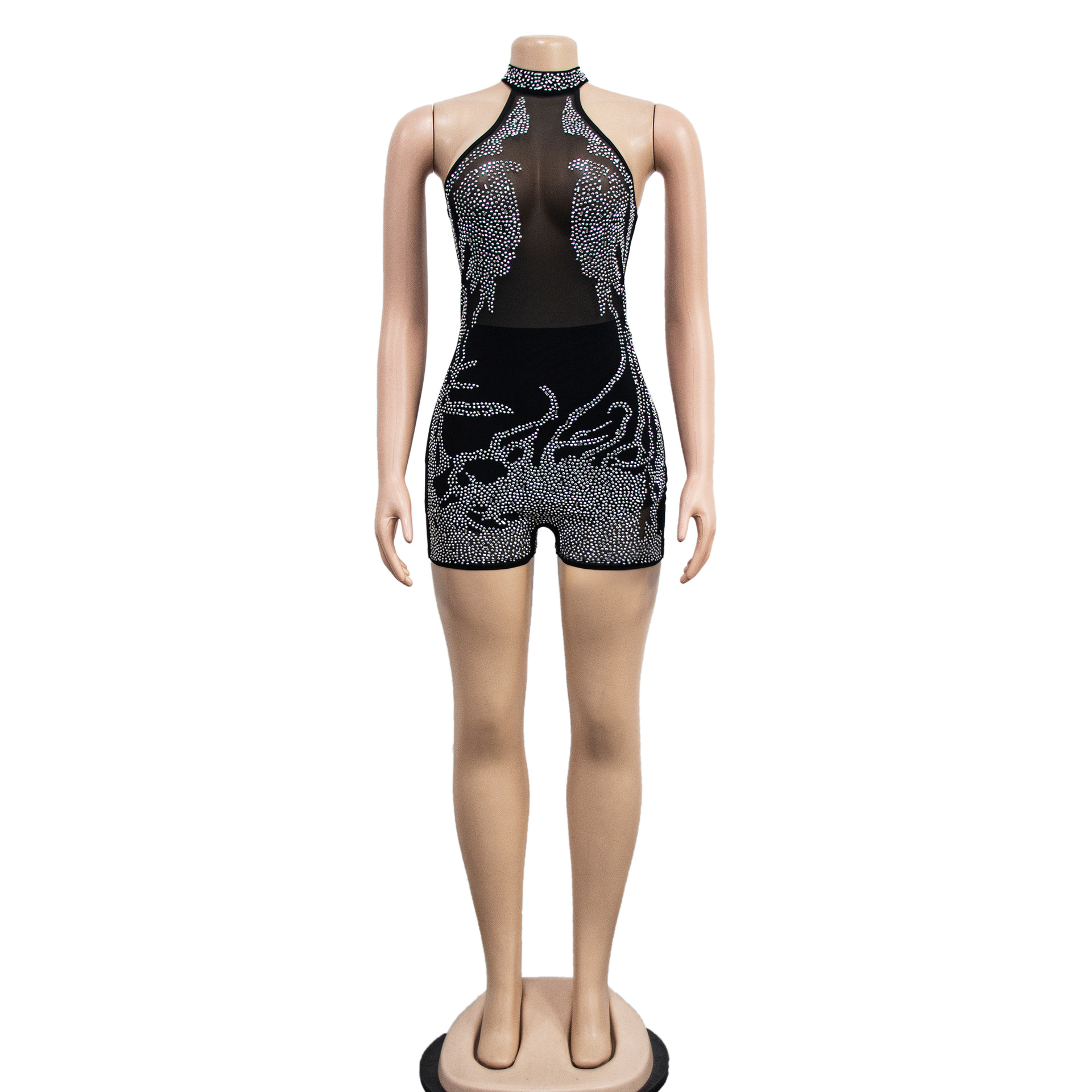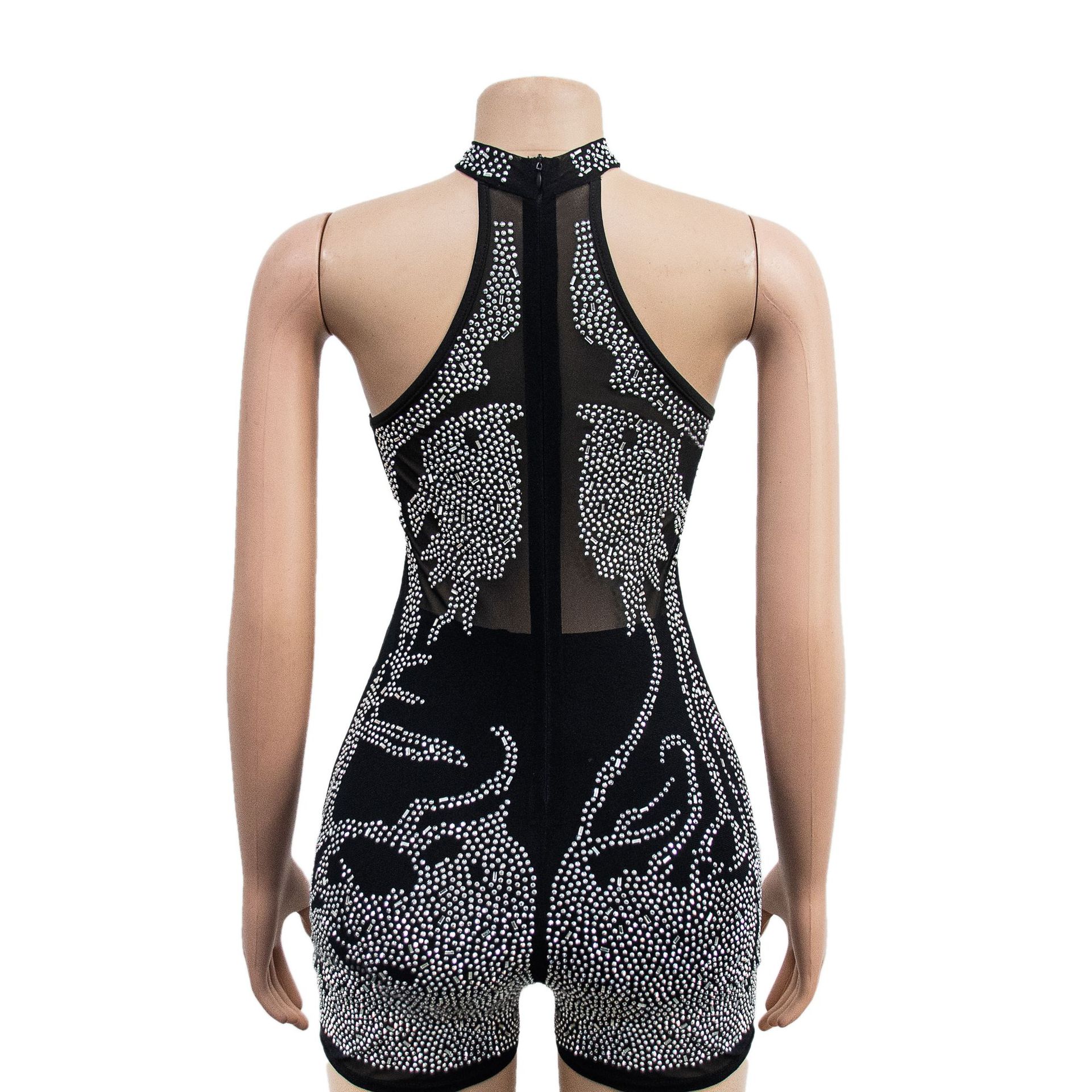 Wear Mesh See through Rhinestone Sleeveless Shorts Jumpsuit